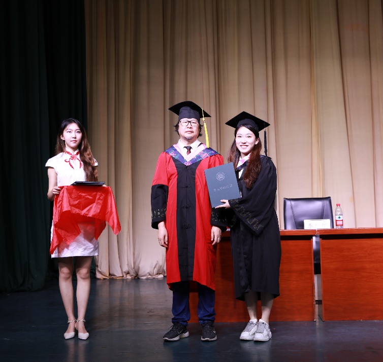 党委副书记冯业栋和学院副院长范蓓为毕业生一一授位和颁发毕业证书。授位结束后,全体人员齐唱《成人影片
