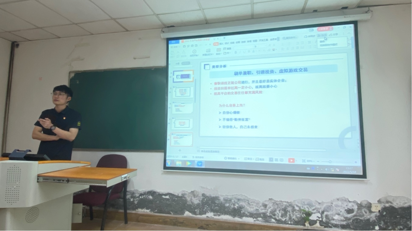 讲座上,雷泽老师结合真实案例通过播放视频短片、PPT课件等形式,为同学们讲解了电信网络诈骗的本质及特点,介绍了冒充客服、冒充公检法、冒充师友、刷单兼职、投资理财等几种常见的电信网络诈骗类型,深入讲解了骗子常用的诈骗套路与手段,并针对不同的诈骗类型提出了有针对性的防范措施。雷老师还叮嘱同学们在日常学习生活中要加强反诈安全知识的学习,增强防范意识和能力。