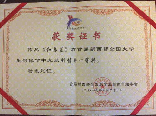 学生积极参赛,共有七部作品入围,最终,2016级硕士研究生解瞾昕同学编剧和执导的作品《红与蓝》获得了剧情片一等奖,2013级广播电视编导专业本科生杨蔓青同学编剧和导演的作品《喜讯》获得剧情片三等奖。