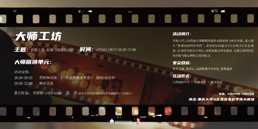常务副院长范蓓主持。现场放映了贾樟柯导演作品《一直游到海水变蓝》。贾樟柯导演结合其三十多年电影创作经历,与在场师生深入探讨了地缘记忆、创作方法、技术哲学与艺术本体等多个核心议题。