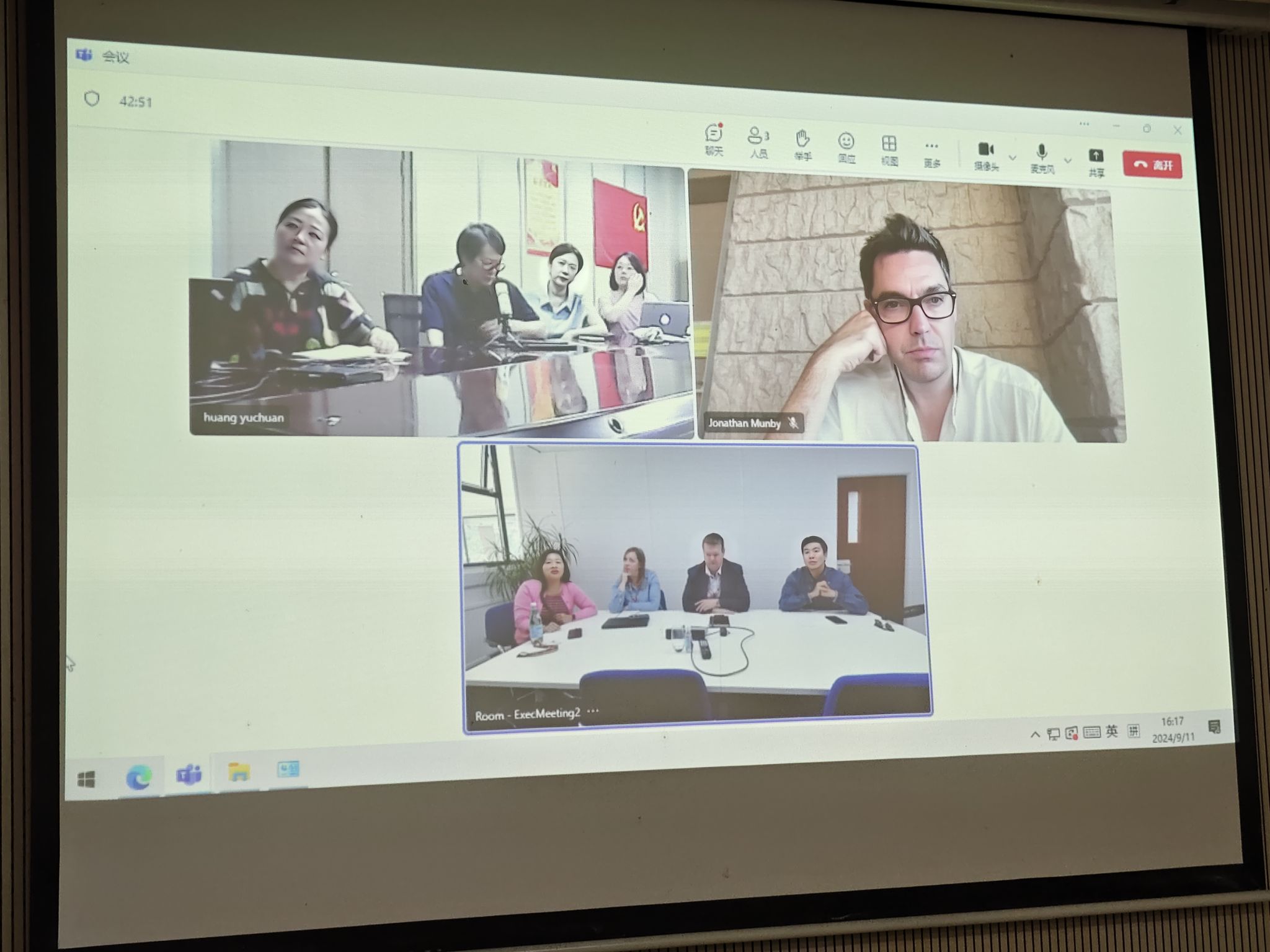 常务副院长范蓓、院长助理王琦、表演系主任王希、表演系副主任刘静,以及表演系秘书郑石参会。威尔士皇家音乐戏剧学院的参会人员有戏剧表演总监、知名戏剧导演乔纳森·蒙比、学生体验总监、国际交流与合作事务总监布莱恩·威尔、招生主管卡拉·贝塞特和亚洲事务理事长王海凤等。