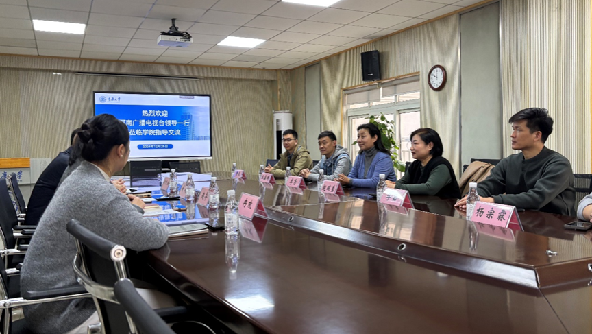 赵华向赵瑞莹总监一行的到来表示热烈欢迎。她围绕专业设置、师资力量、学生规模与就业等方面介绍了学院的基本情况。她表示,学院高度重视人才培养与学生就业工作,不断致力于探索校企合作的新模式、新路径。黄鹏介绍了学院在人才培养、办学定位、专业特色、学生实习实践等方面的情况,就学院与河南广播电视台开展全面深化合作进行了展望与可行性分析。