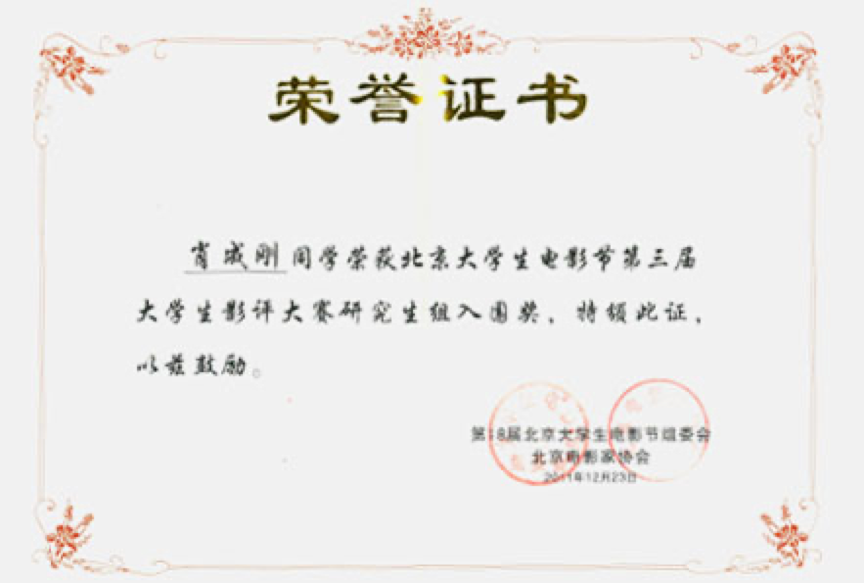 2009级研究生肖成刚同学撰写的文章《海上传奇:空间与历史》,获得了北京大学生电影节第三届大学生影评大赛研究生组的入围奖。
